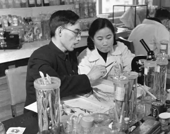 20世纪50年代,在中医研究院中药研究所任研究实习员的屠呦呦(前右)与老师楼之岑副教授一起研究中药。
