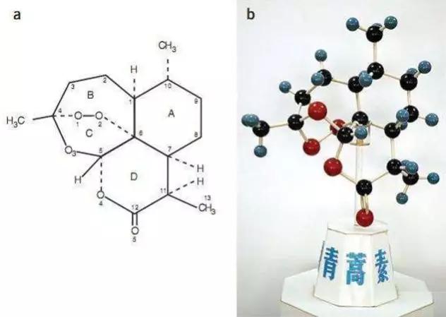 (a) 青蒿素的分子结构。(b) 青蒿素的三维结构模型,碳原子是黑色小球,氢原子是蓝色小球,氧原子是红色小球。