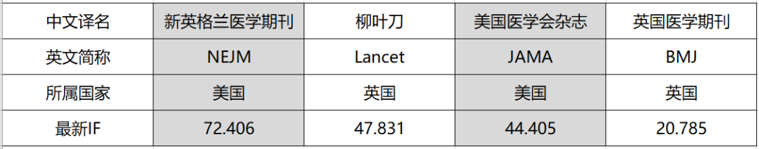 众所周知,新英格兰医学杂志(NEJM)、柳叶刀(Lancet)、美国医学会杂志(JAMA)、英国医学期刊(BMJ),被合称为“四大顶级医学期刊”。